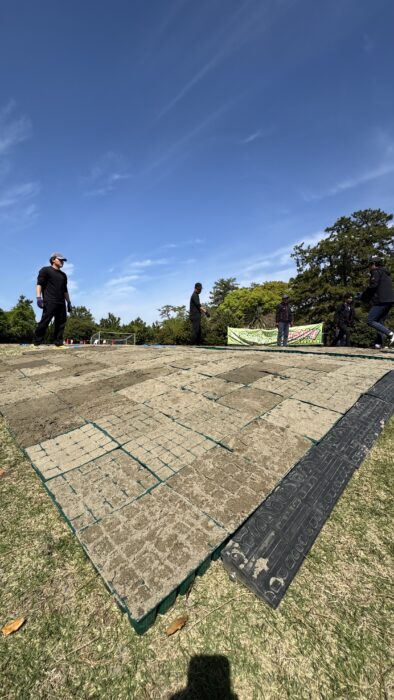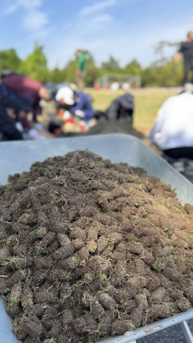 このポット苗というものは、清水エスパルスの練習場の整備の際に出る芝生の株を、専用のシートに砂を敷き詰めその株を植えて芝生の苗を作るものです。
