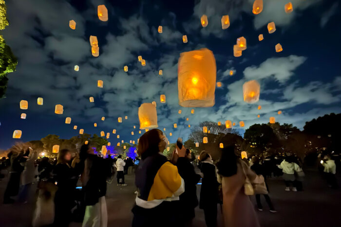 夜のお楽しみは、幻想的なクリスマスランタンナイト!やさしい光に包まれたランタンが夜空に浮かび、まるで絵本の世界に迷い込んだようなひとときに♪