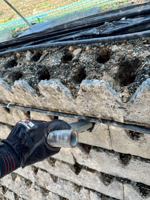今回予定していた作業は、石垣へ定植(新しいイチゴの苗の植え付け)でしたが、山内屋さんから「花芽分化がまだ0%で今日はまだできない」というご説明がありました。この花芽分化とは、いちごが生殖活動のために花となる芽(花芽)を形成する現象で、その花芽が顕微鏡で検査してみたところまだ芽が見えないということでした。この状態で定植しても生育が安定せず、収穫時期や量、品質に悪影響を及ぼす可能性があるため、今回の定植は先送りとなりました。