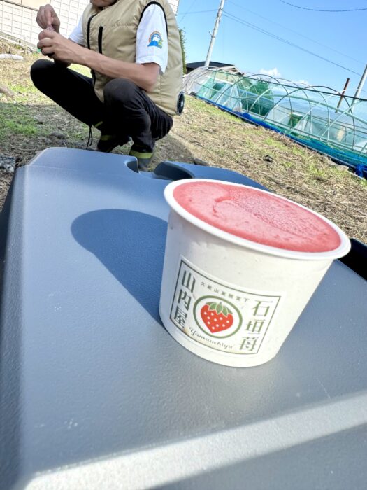 作業の休憩時には、山内屋さん特製のいちごジェラートをいただきながらひと休み。暑さで火照った体に、甘酸っぱくてひんやり冷たい味がしみわたり、疲れもふっと吹き飛ぶご褒美となりました。