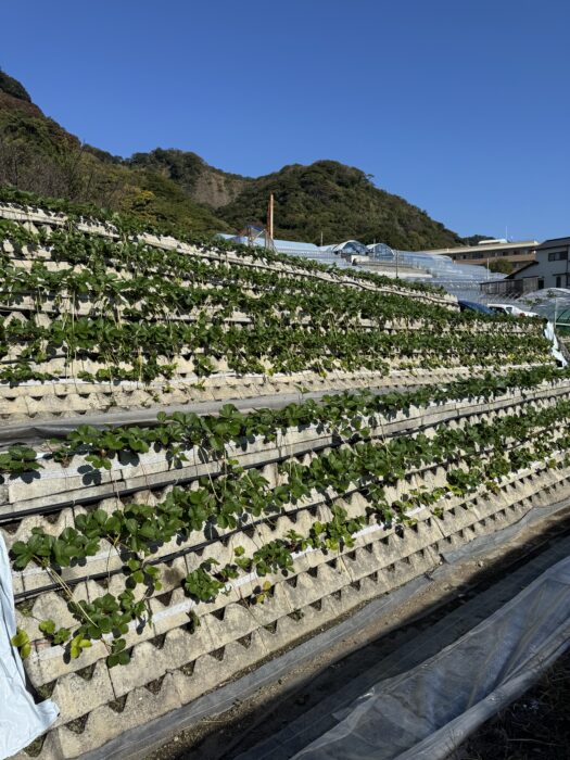 現地に到着すると、ハウスのビニールと骨組みが取り除かれて、冷たい風の中でも力強く根を張るいちごの苗たちが迎えてくれました。