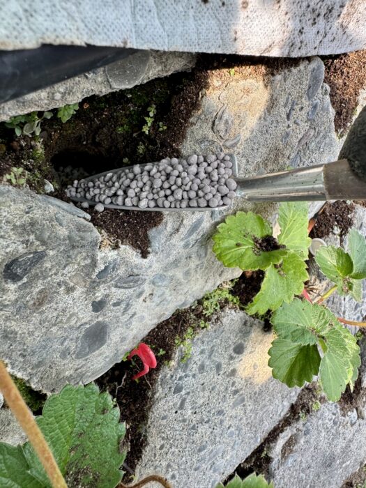 空けた穴にひとつずつ手作業で肥料を入れていきます。