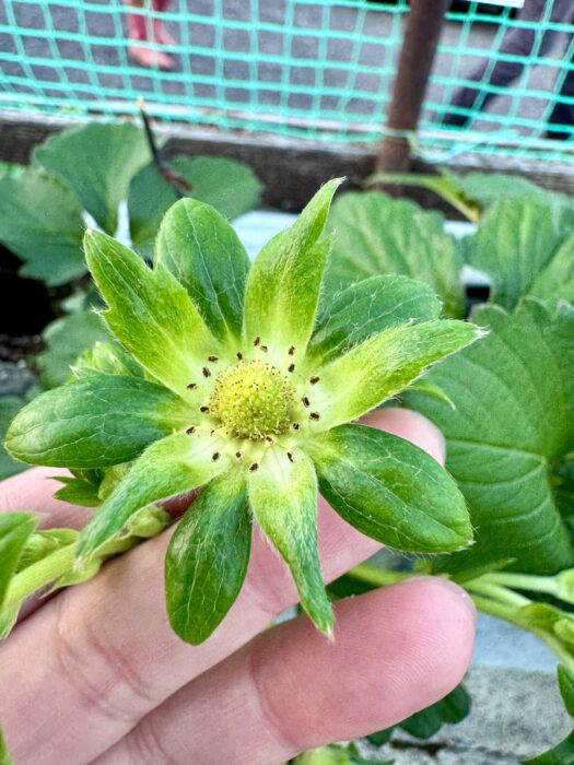 花びらが落ちた後、この真ん中の芽が膨らんでイチゴに成長するようです。