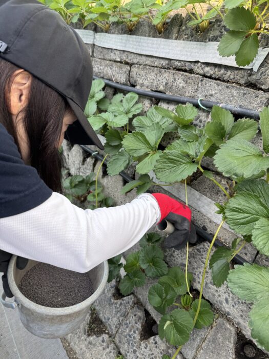 この日の作業は大きく3つ。1つ目は、苗下に穴を掘り有機肥料を施す「追肥作業」。この肥料はこれからの寒さに備え、苗に栄養を与える大切な役割を果たします。