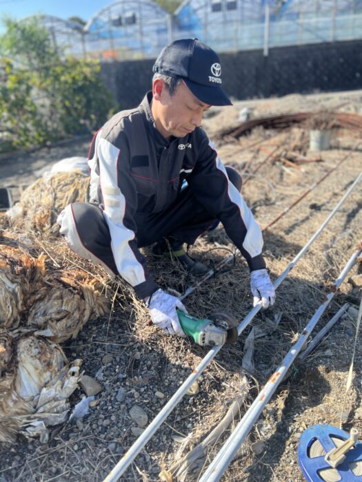 2つ目は、ビニールハウスの補修作業。鋼管の切断、骨組みの調整、害獣被害の対策といった作業をしながら進めました。