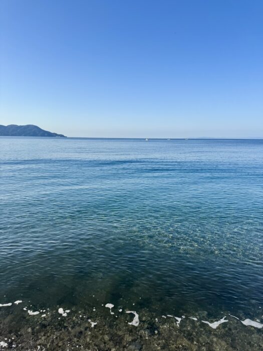 風が無いことから、波打ち際で海を見ると水も透き通っていて綺麗な海をみることができ心が洗われた気分になりました。